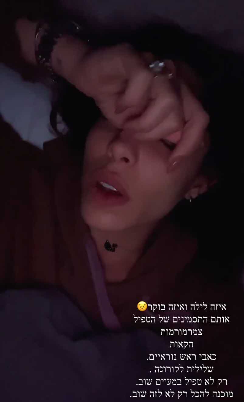 והוסיפה:"רק לא טפיל במעיים שוב. מוכנה לכל רק לא לזה שוב." בוידאו שהעלתה הוסיפה גם מסר קולי כשהיא נשמעת לגמרי לא במיטבה:"אוף רק לא עוד הפעם, בבקשה תאחלו לי שזה וירוס ולא משהו אחר. אני מרגישה נורא."