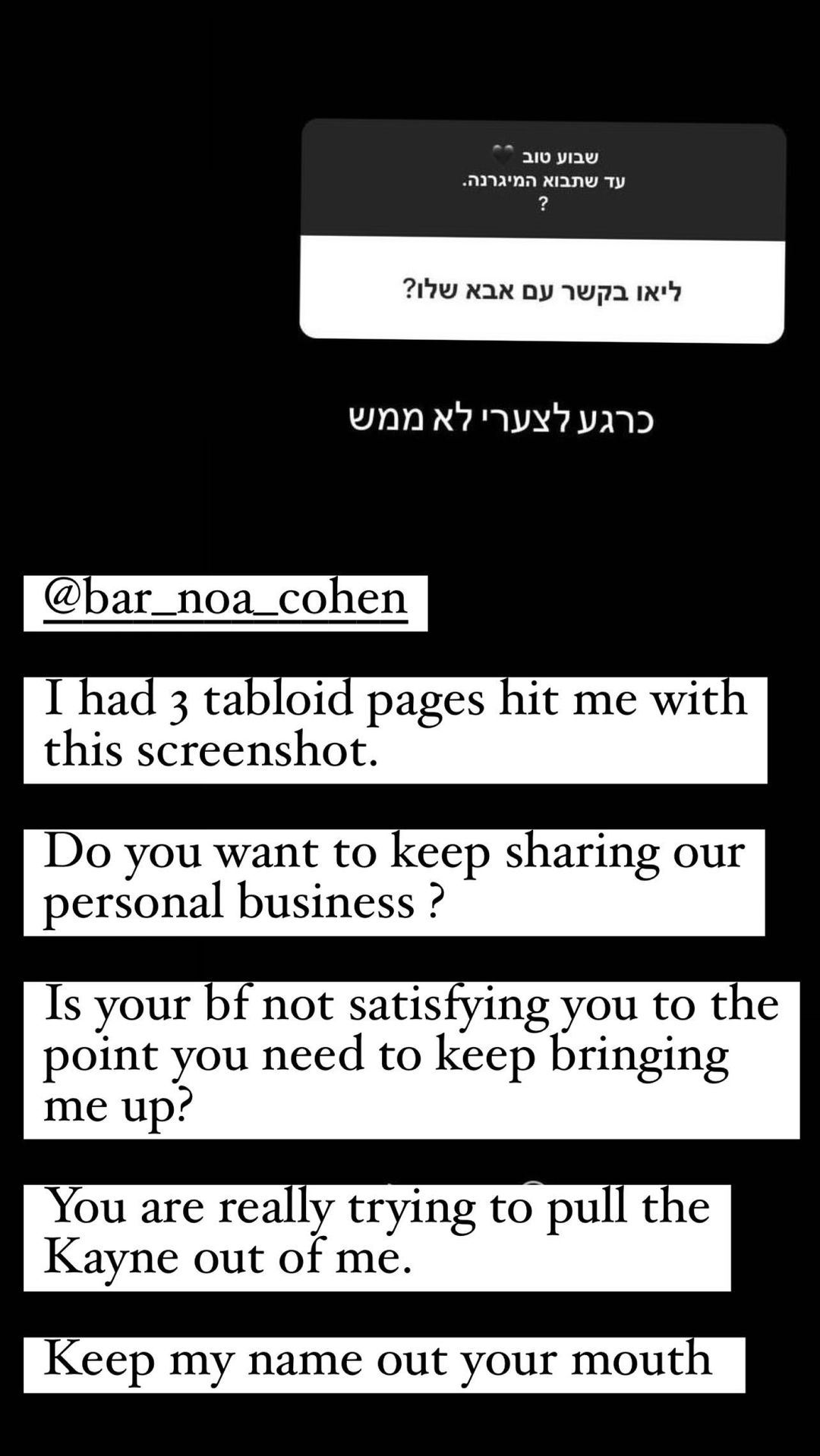 עוקבת שאלה את בר שאלה על פניו נורמטיבית: "ליאו בקשר עם אבא שלו?", בר ללא היסוס הגיבה לכאורה בפשטות: "כרגע לצערי לא ממש". כנראה שאייזק לא מרבה להיכנס לסטורי של האקסית שלו ופספס תחילה את מה שהעלתה, ונחשף לסטורי הזה רק אחרי שעמודי בידור שלחו לו אותו.