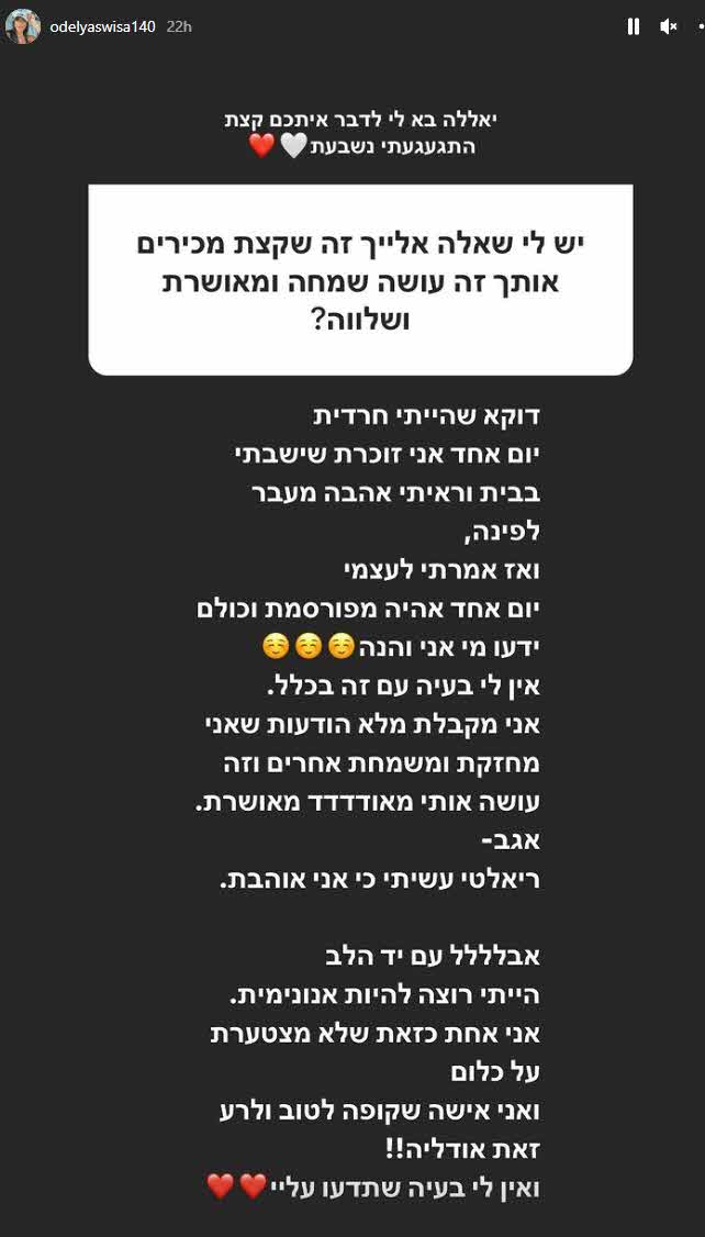 אחד מעוקביה של אודליה סויסה שאל אותה בסטורי:"יש לי שאלה אלייך. זה שקצת מכירים אותך. זה עושה אותך שמחה, מאושרת ושלווה?". אודליה הגיבה:"דווקא שהייתי חרדית. יום אחד אני זוכרת שישבתי בבית וראיתי אהבה מעבר לפינה, ואז אמרתי לעצמי. יום אחד אהיה מפורסמת וכולם ידעו מי אני והנה."