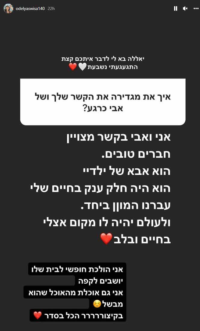 אותה שאלה לא יכלה שלא להוביל לשאלה אחרת שסקרנה מאוד את העוקבים של אודליה. מה קורה כרגע בינה לבין הגרוש הטרי שלה. אבי סויסה שעל פי הפרסומים קרו ביניהם לא מעט דרמות מאז הפרידה.