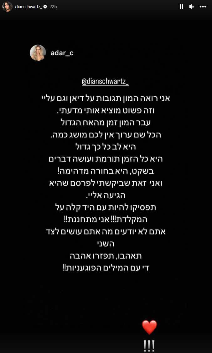 דיאן הגיעה לבקר את מעצבת האופנה אדר כהן שאיבדה לפני כשבועיים את ידה לאחר תאונה קשה במקסיקו ובין היתר התגייסה למענה ושיתפה את הסיפור שלה. אך בתקשורת החליטו להתמקד במשפט אחד של דיאן:" היא כוסית, היא בטח עוקבת אחריי – אז נכנסתי והיא באמת עקבה אחריי"