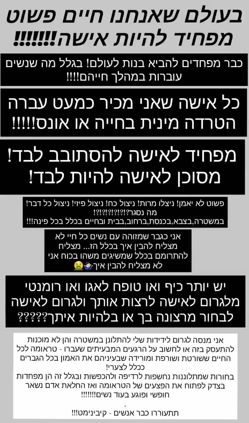 והוסיף:"מפחיד לאישה להסתובב לבד! מסוכן לאישה להיות לבד! פשוט לא יאמן! ניצלו מרות! ניצול כח! ניצול פיזי! ניצול כל דבר! מה נסגר!? במשטרה, בצבא, בכנסת, ברחוב, בבית ובחיים בכלל בכל פינה! אני כגבר שמזוהה עם נשים כל חיי לא מצליח להבין איך בכלל הז… מצליח להתרומם בכלל שמשיכים משהו בכוח, אני לא מצליח להבין איך".