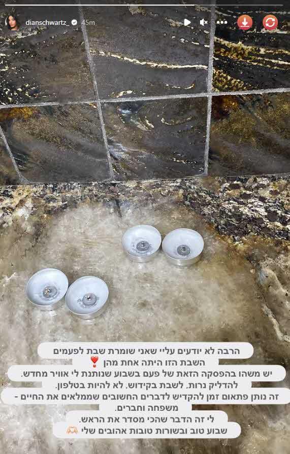 "הרבה לא יודעים עליי שאני שומרת שבת לפעמים, השבת הזו היתה אחת מהן" כתבה דיאן והוסיפה:"יש משהו בהפסקה הזאת של פעם בשבוע שנותנת לי אוויר מחדש. להדליק נרות, לשבת בקידוש, לא להיות בטלפון. זה נותן פתאום זמן להקדיש לדברים החשובים שממלאים את החיים – משפחה וחברים. לי זה הדבר שהכי מסדר את הראש. שבוע טוב ובשורות טובות אהובים שלי."