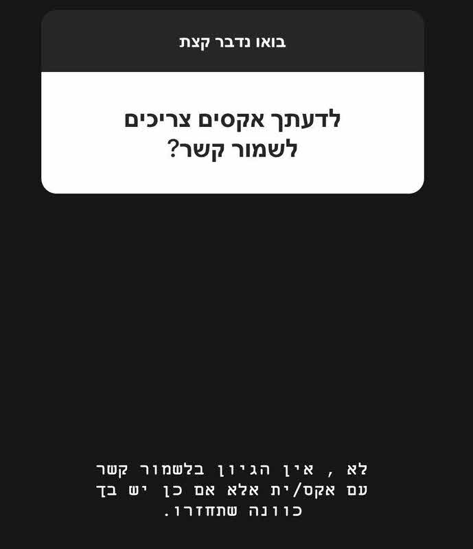 עוד נשאל נתנאל:"לדעתך אקסים צריכים לשמור על קשר?" וגם פה הגיב בנחרצות:"לא, אין הגיון בלשמור קשר עם אקסית אלא אם כן יש בך כוונה שתחזרו."