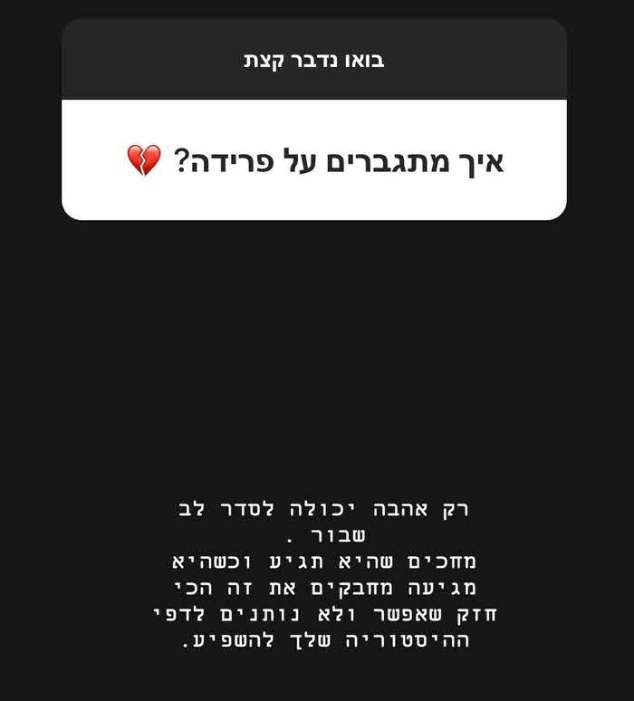 נתנאל מצידו החליט לצאת בסשן שאלות ותשובות עם עוקביו שהתקילו אותו כמובן בשאלה:"איך מתגברים על פרידה?" נתנאל השיב:"רק אהבה יכולה לסדר לב שבור. מחכים שהיא תגיע וכשהיא מגיעה מחבקים את זה הכי חזק שאפשר ולא נותנים לדפי ההיסטוריה שלך להשפיע".