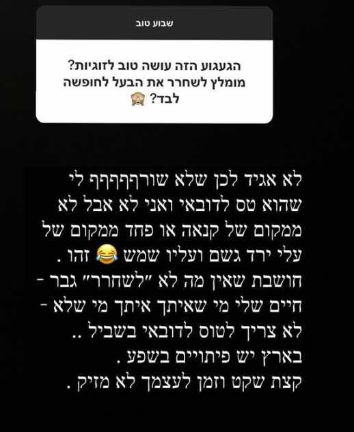 "לא אגיד לכן שלא שורף לי שהוא טס לדובאי ואני לא אבל לא ממקום של קנאה או פחד, ממקום שעלי ירד גשם ועליו שמש, זהו." והוסיפה:"חושבת שאין מה לא 'לשחרר' גבר, חיים שלי מי שאיתך, איתך. מיא שלא, לא צריך לטוס לדובאי בשביל .. בארץ יש פיתויים בשפע. קצת שקט וזמן לעצמך לא מזיק."