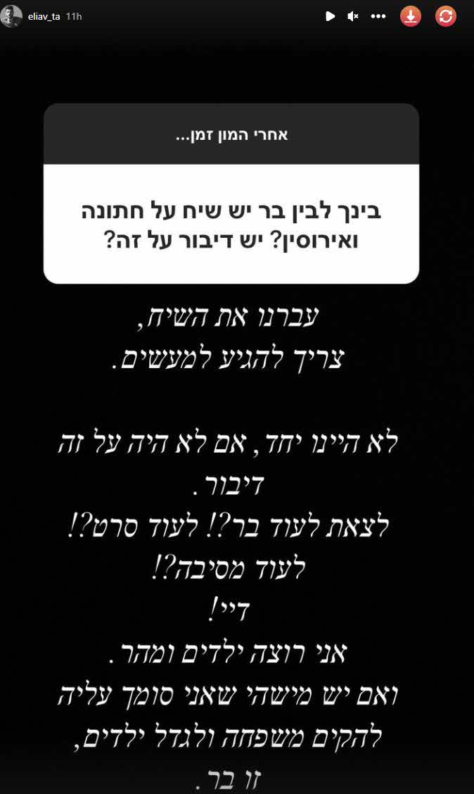 אך השיא היה כשאליאב נשאל אם יש דיבור על חתונה בינו לבין בר, הפעם הוא החליט להעלות הילוך ונראה שבקרוב מאוד זה הולך לקרות!? כך השיב:"עברנו את השיח, צריך להגיע למעשים. לא היינו יחד, אם לא היה על זה דיבור. לצאת לעוד בר?! לעוד סרט?! לעוד מסיבה?! דיי! אני רוצה ילדים ומהר! ואם יש מישהי שאני סומך עליה להקים משפחה ולגדל ילדים, זו בר."