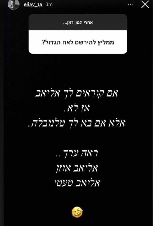 ונעבר לאתנחתא הקומית, כשאליאב נשאל אם הוא ממליץ להירשם ל"אח הגדול", הוא השיב:"אם קוראים לך אליאב אז לא. אלא אם בא לך טלנובלה. ראה ערך אליאב אוזן, אליאב טעטי."