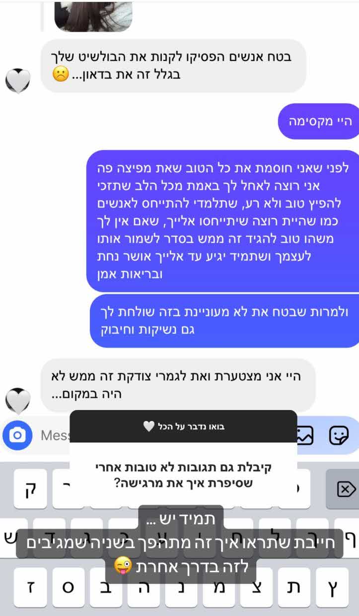 טליה הוסיפה:"ולמרות שבטח את לא מעוניינת בזה, שולחת לך גם נשיקות וחיבוק". אותה גולשת המומה השיבה לטליה:"היי, אני מצטערת ואת לגמרי צודקת. זה ממש לא היה במקום…" טליה שיתפה לעוקביה את ההתכתבות וסיכמה:"חייבת שתראו איך זה מתהפך בשניה שמגיבים לזה בדרך אחרת".