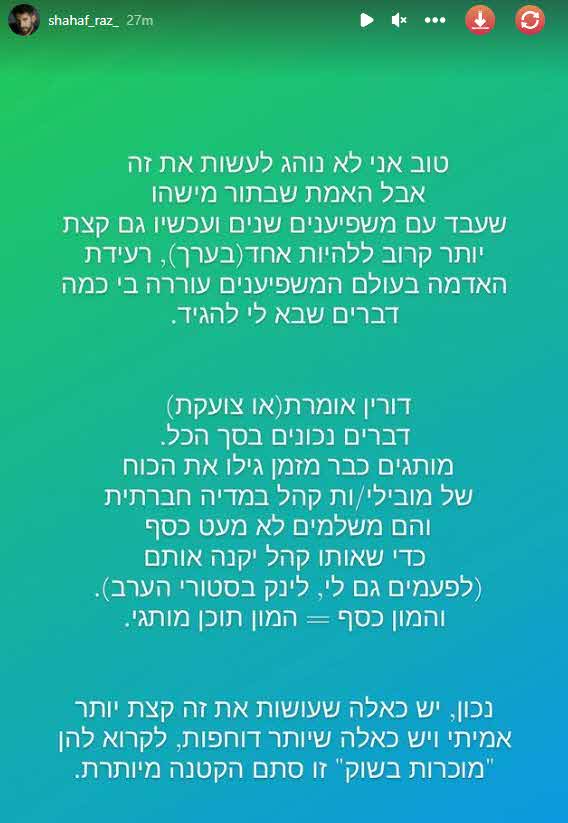 שחף רז החליט מתערב בעניין והחליט לתת את נקודת מבטו לזעקתה של דורין אטיאס, תמך אך מנגד הביע ביקורת. שחף כתב:"טוב אני לא נוהג לעשות את זה אבל האמת שבתור מישהו שעבד עם משפיענים שנים ועכשיו גם קצת יותר קרוב ללהיות אחד(בערך), רעידת האדמה בעולם המשפיענים עוררה בי כמה דברים שבא לי להגיד".