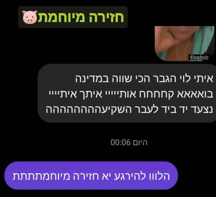 ואז שיתפה דבר נוסף שאולי גרר את תגובתו של לוי בהמשך:"עשיתי ככה ברכה לאיתי לוי. באתי להגיד לו י'חזיר. ואז נזכרתי שהוא כאילו לא יבין את ההומור, אולי הוא יפגע. אז אמרתי לו כזה.. י'חתיך חחח"