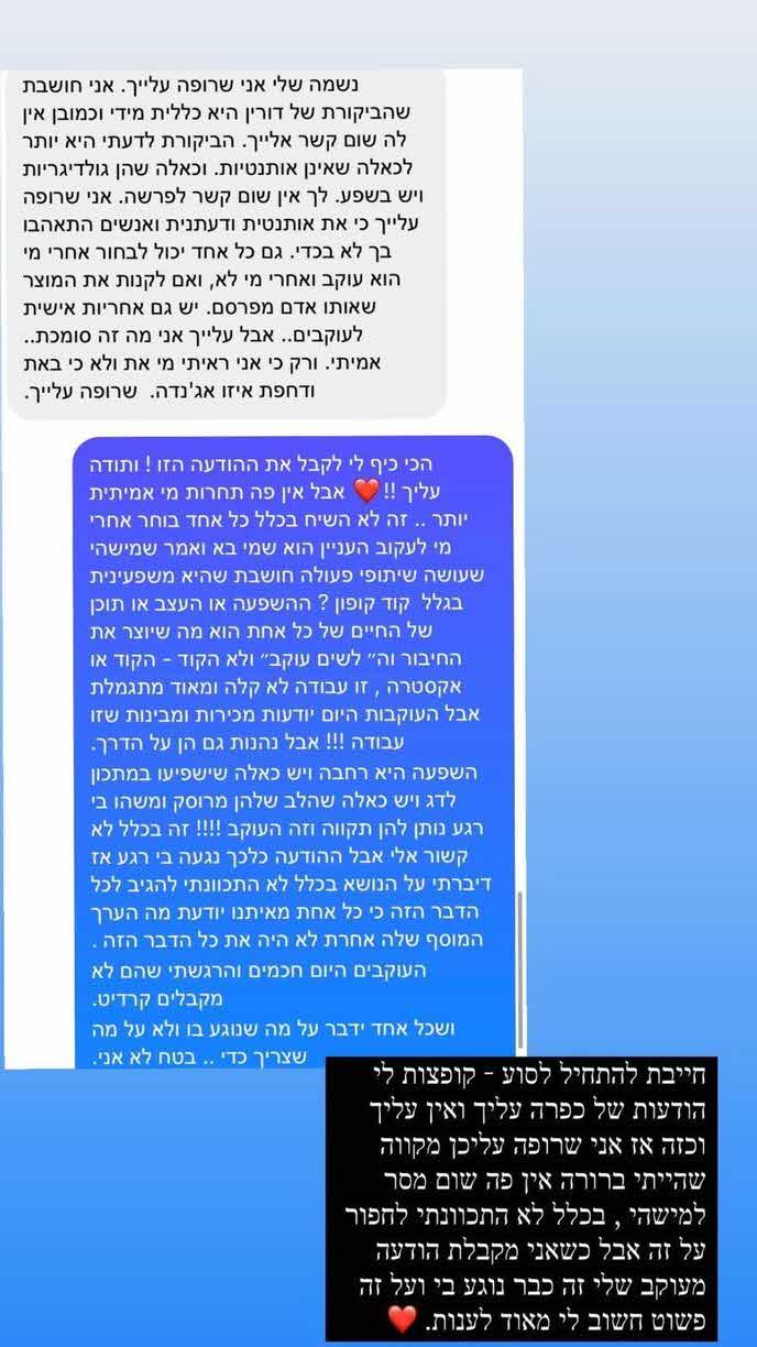 "יש גם בנות עם 5000 עוקבים שמשפיעות ואומרות את דעתן וההשפעה היא ממש לא קודים ולא קופון! אף אחת שמעבירה ביקורת לא יודעת במי מישהי משפיעה על מישהי אחרת, או מה קורה לה בדיירקט ב-12 בלילה שהיא יושבת ועונה להודעות."