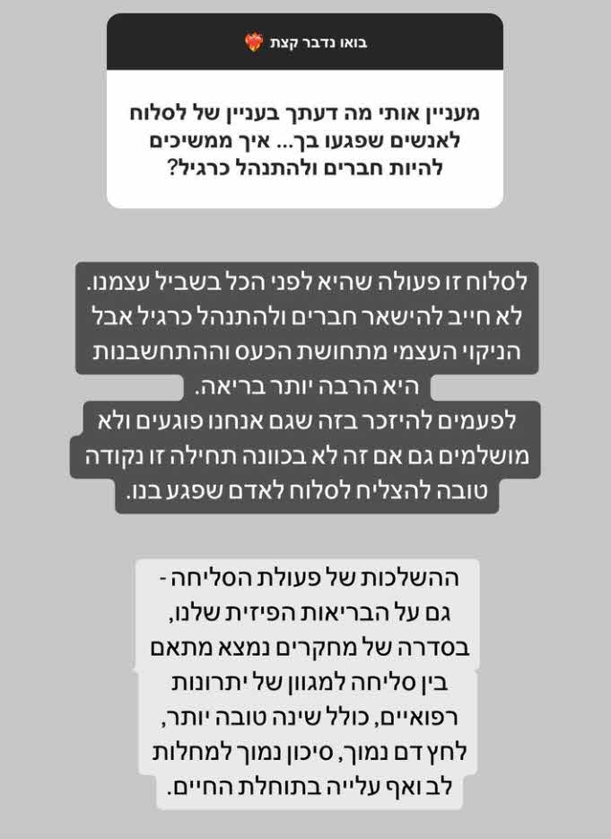 והשיבה:"לסלוח זו פעולה שהיא לפני הכל בשביל עצמנו. לא חייב להישאר חברים ולהתנהל כרגיל אבל הניקוי העצמי מתחושת הכעס וההתחשבנות היא הרבה יותר בריאה. לפעמים להיזכר בזה שגם אנחנו פוגעים ולא מושלמים גם אם זה לא בכוונה תחילה זו נקודה טובה להצליח לסלוח לאדם שפגע בנו."