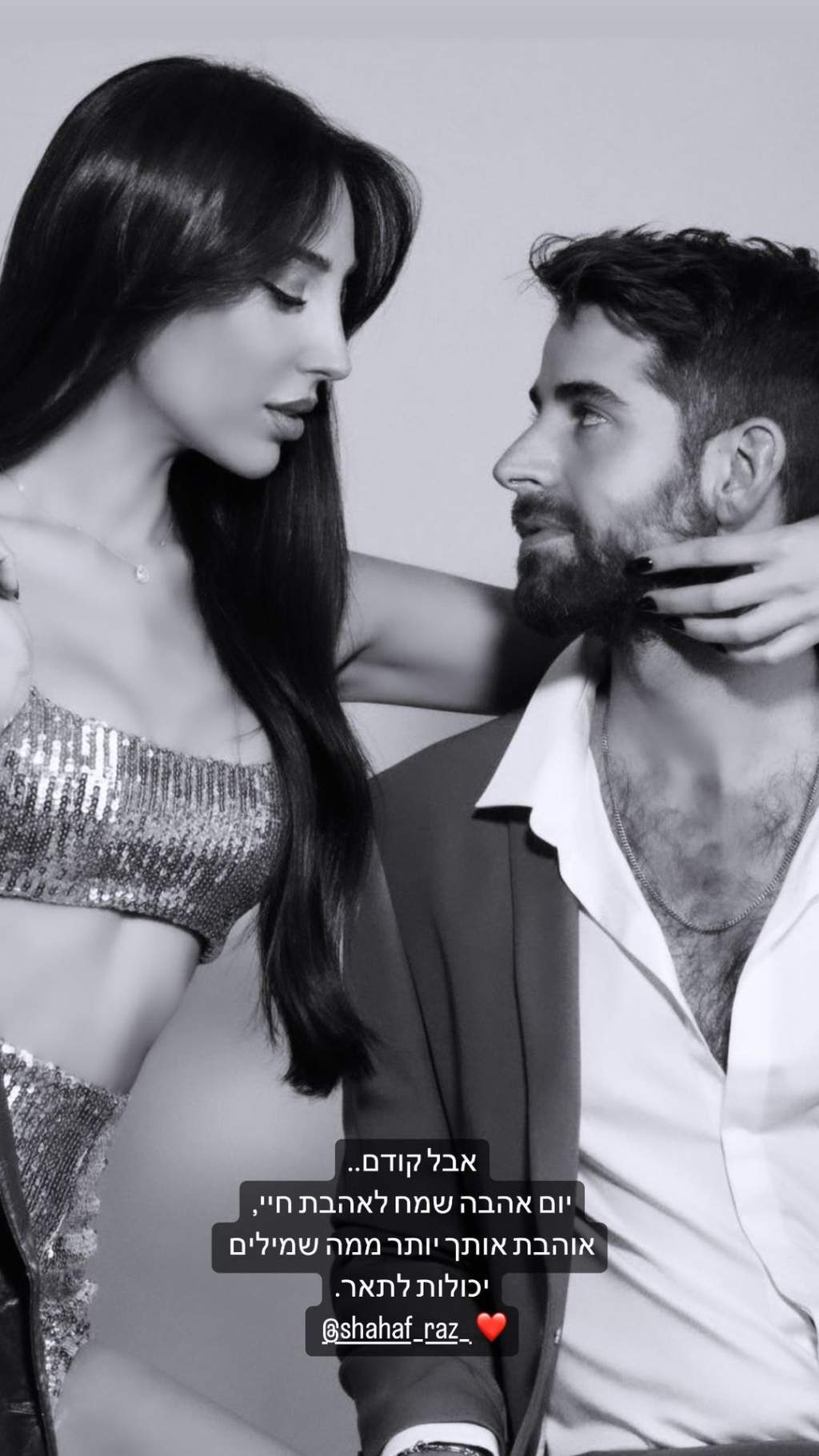 רז כתב:"את הבית שלי, העתיד שלי, העוגן שלי, השפיות שלי, החברה הכי טובה שלי, ההשראה והאומץ שלי. את כל מה שביקשתי וכל מה שאי פעם ארצה, את המלכה שלי. אני מאחל לנו חיים שלמים להרגיש, לחוות, להיות אחד בשביל השניה, לצחוק ולהצחיק, להעריך, לכבד, להכיל, לעשות טוב, לעורר השראה אחת בשני ולאהוב כל יום כמו שאנחנו אוהבים מהרגע הראשון שלנו ביחד. יום אהבה שמח".