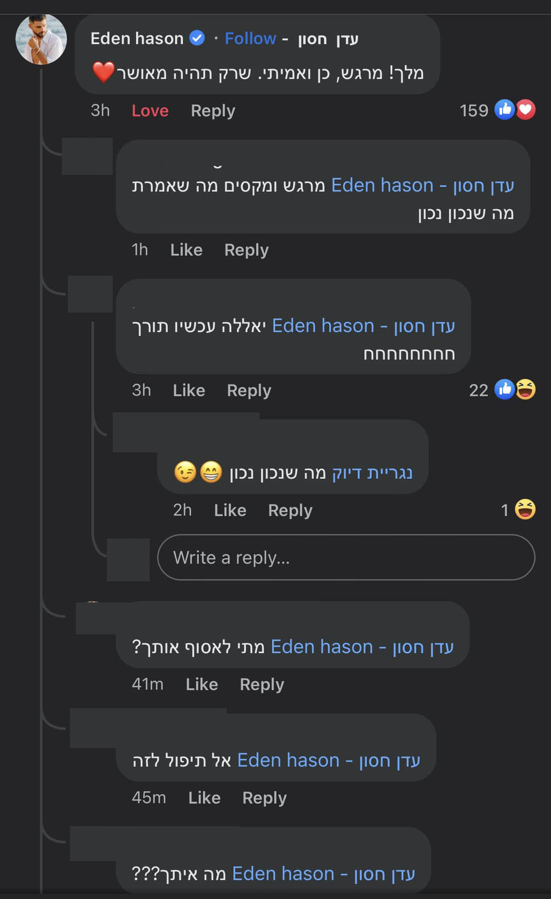 בתגובות נכתב לעדן חסון:"יאללה עכשיו תורך חחחחח" , "מה איתך???" ושלל תגובות לא נעימות. אחת הגולשות החליטה להשיב לאותם מגיבים:"שונאת את האובססיה הזאת אליו ולאיתי לוי בקטע הזה אם הם לא יוצאים מהארון, או שהם לא מוכנים לזה או שהם לא. מה זה עניינכם"