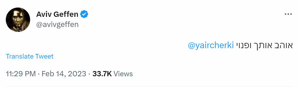 אביב גפן תייג בחשבון הטוויטר שלו את יאיר שרקי לצד הכיתוב:"אוהב אותך ופנוי". אותן שלוש מילים הצליחו להסעיר מאוד את המרחב הוירטואלי. בזמן שחלק מהגולשים לקחו זאת בהומור והחליטו להשיב באותו מטבע:"אני לא אוהב בנים. אבל את שרקי כן."