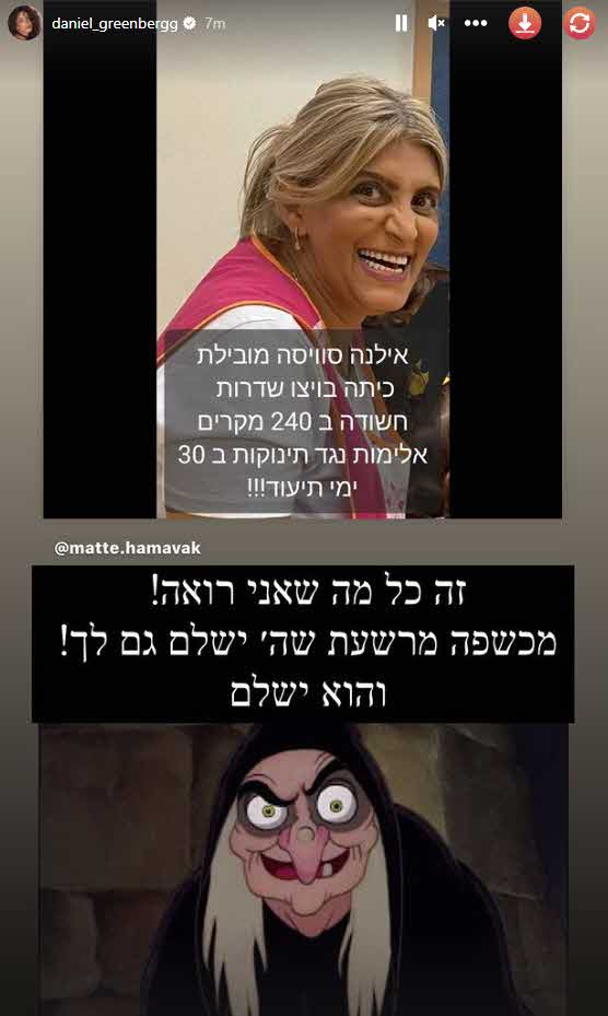 גרינברג שלא יכלה להישאר אדישה לחשיפה הבלתי נתפסת הזאת החליטה לשתף את העוקבות שלה בסטורי עם תמונתה של אילנה סוויסה לצד תמונתה של המכשפה משלגיה וכתבה:"זה כל מה שאני רואה! מכשפה מרשעת שה' ישלם גם לך! והוא ישלם".