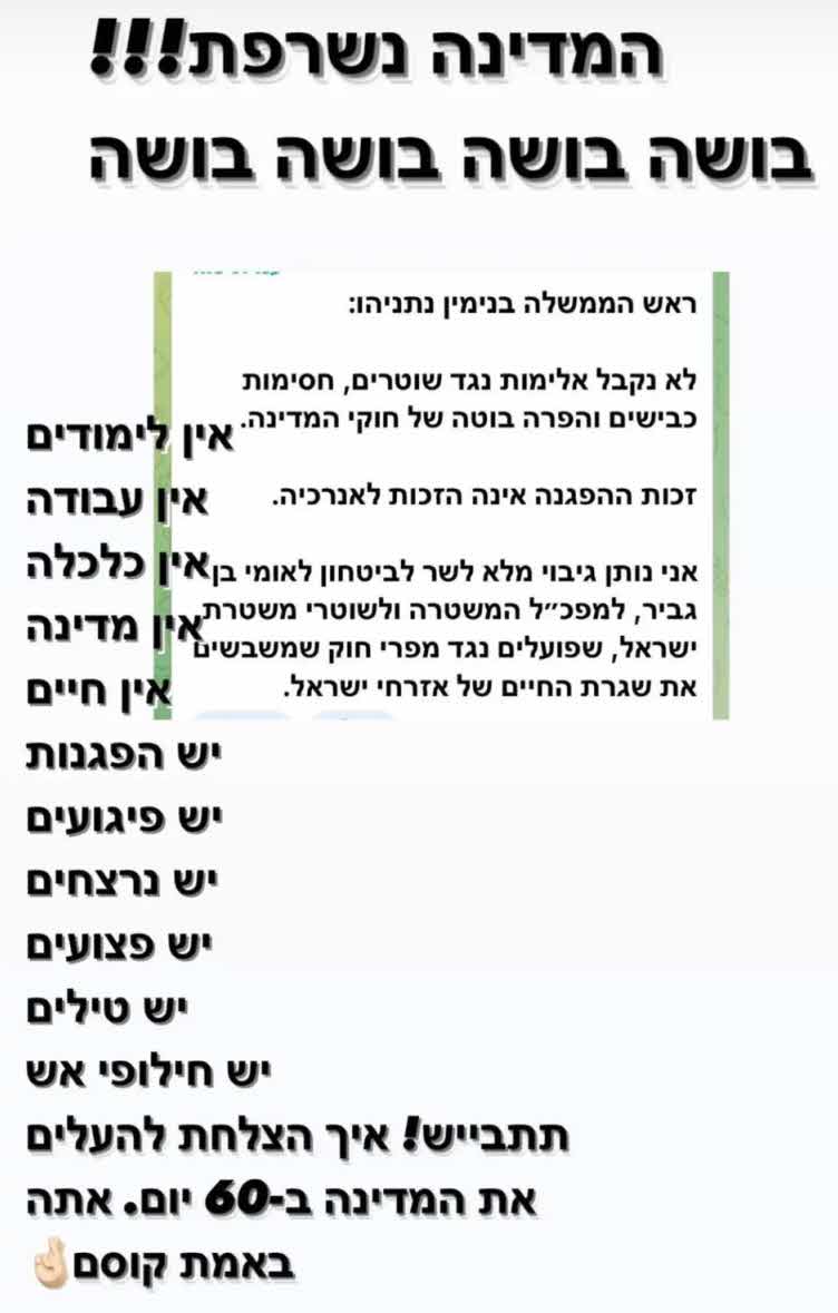 "אין לימודים, אין עבודה, אין כלכלה, אין מדינה, אין חיים, יש הפגנות, יש פיגועים, יש נרצחים, יש פצועים, יש טילים, יש חילופי אש. תתבייש! איך הצלחת להעלים את המדינה ב-60 יום. אתה באמת קוסם."