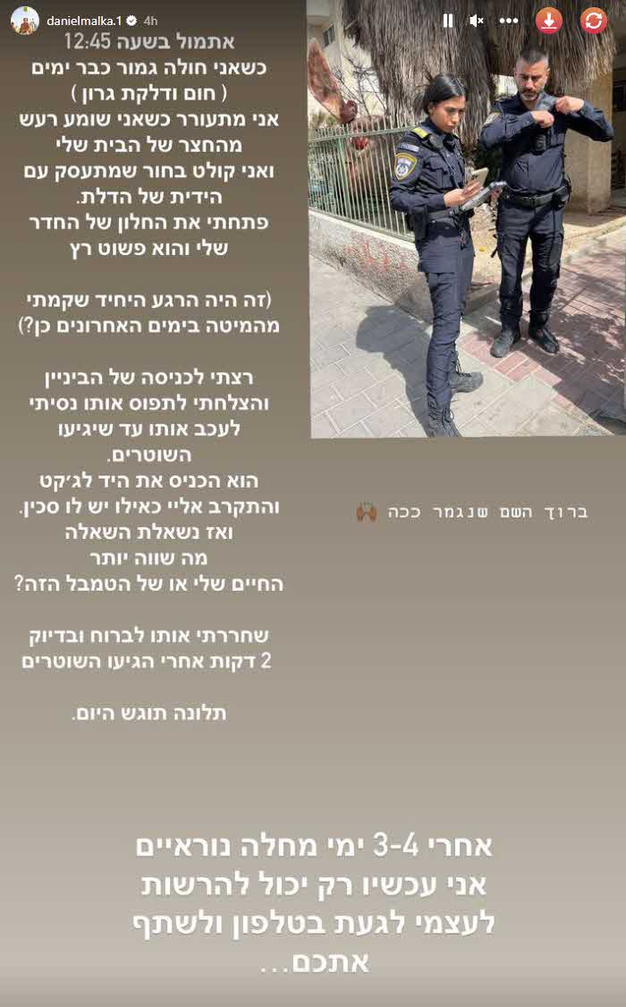 דניאל שחזר היום מקרה שחווה אמש:"אתמול בשעה 12:45 כשאני חולה גמור כבר ימים, אני מתעורר כשאני שומע רעש מהחצר של הבית שלי ואני קולט בחור שמתעסק עם הדלת. פתחתי את החלון של החדר שלי והוא פשוט רץ".