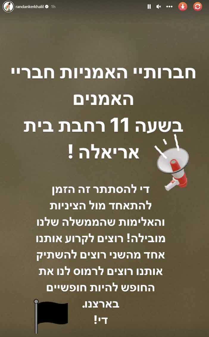 והוסיף:"די להסתתר, זה הזמן להתאחד מול הציניות והאלימות שהממשלה שלנו מובילה! רוצים לקרוע אותנו אחד מהשני. רוצים להשתיק אותנו, רוצים לרמוס לנו את החופש להיות חופשיים בארצנו. די!".