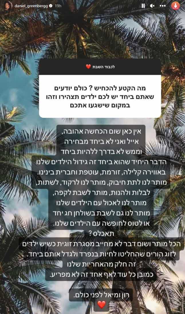 דניאל גרינברג שהחליטה לשתף את השאלה הזאת ממש, איך שהיא ובלי פילטרים, השיבה לה בצורה הבאה:"אין כאן שום הכחשה אהובה, אייל ואני לא ביחד מבחירה וממש לא בדרך ללהיות ביחד. הדבר היחיד שהוא ביחד זה גידול הילדים שלנו באווירה קלילה, זורמת,עוטפת וחברית בינינו."