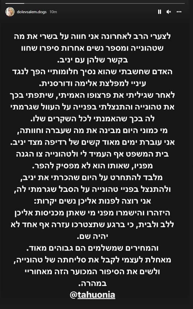 מי שהייתה יד ימינו ובת זוגו של יניב בן משה בחזית שנפתחה ברשתות החברתיות מול גרושתו, טהוניה רובל. דולב סאלם, החליטה לפתוח היום הכל בסטורי מפתיע בו היא טוענת שמה שקרה לטהוניה קרה גם לה.