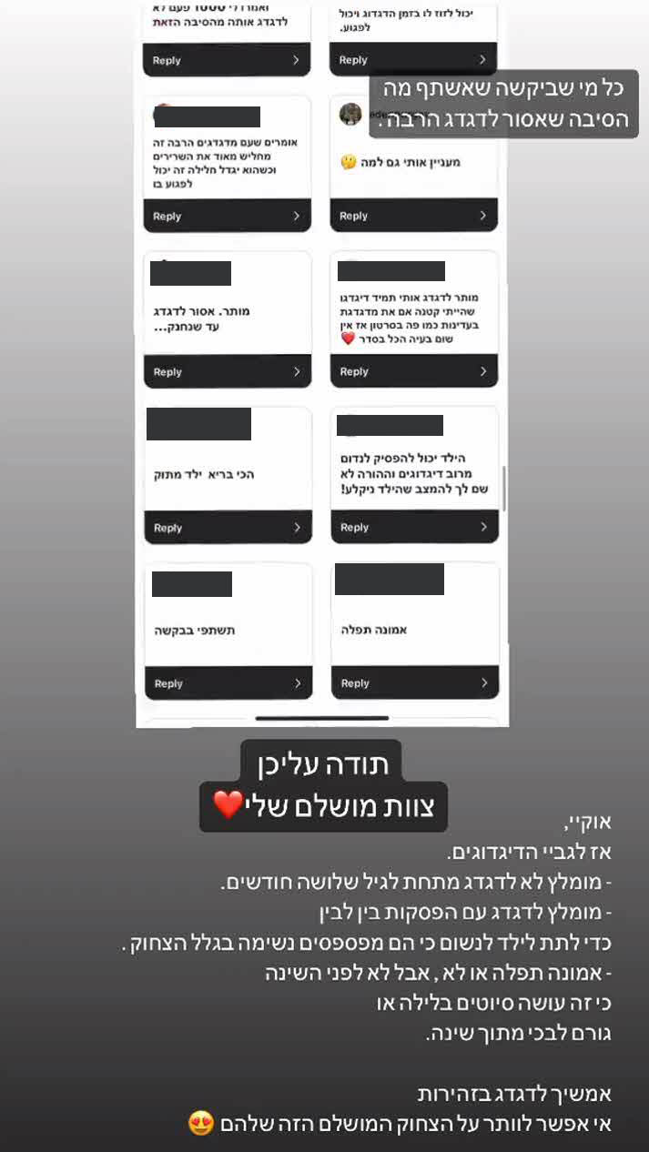 גרינברג עצמה הגיבה לתשובות העוקבות שלה בנושא:"אוקיי, אז לגבי הדגדוגים. מומלץ לא לדגדג מתחת לגיל שלושה חודשים. מומלץ לדגדג עם הפסקות בין לבין כדי לתת לילד לנשום כי הם מפספסים נשימה בגלל הצחוק. אמונה תפלה או לא, אבל לא לפני השינה כי זה עושה סיוטים בלילה או גורים לבכי מתוך שינה."