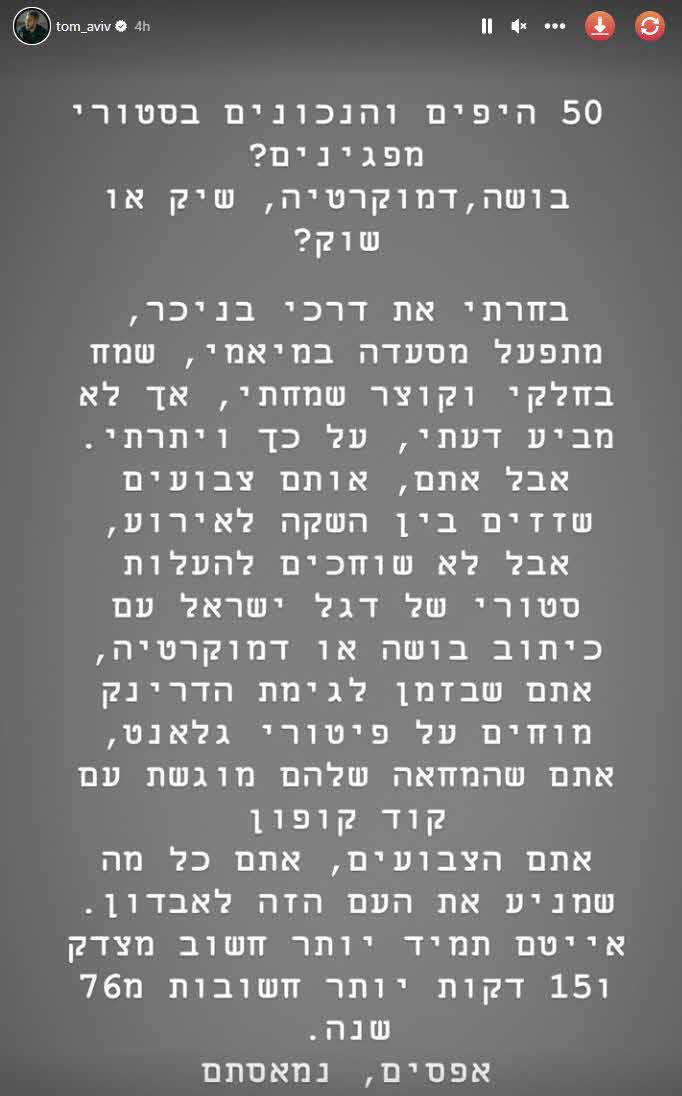 "50 היפים והנכונים בסטורי מפגינים? בושה, דמוקרטיה, שיק או שוק? בחרתי את דרכי בניכר, מתפעל מסעדה במיאמי, שמח בחלקי וקוצר שמחתי, אך לא מביע דעתי, על כך ויתרתי." כתב טום ויצא במתקפה:
