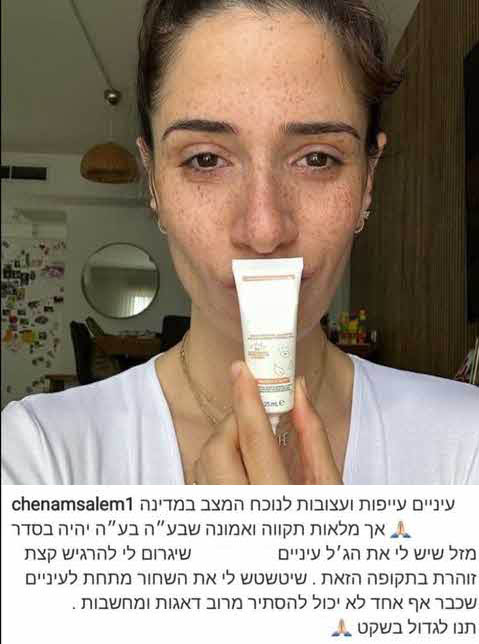 אמסלם כתבה:"עיניים עייפות ועצובות לנוכח המצב במדינה אך מלאות תקווה ואמונה בעזרת השם יהיה בסדר. מזל שיש לי את הג'ל עיניים *** שיגרום לי להרגיש קצת זוהרת בתקופה הזאת. שיטשטש לי את השחור מתחת לעיניים שכבר אף אחד לא יכול להסתיר מרוב דאגות ומחשבות. תנו לגדול בשקט"