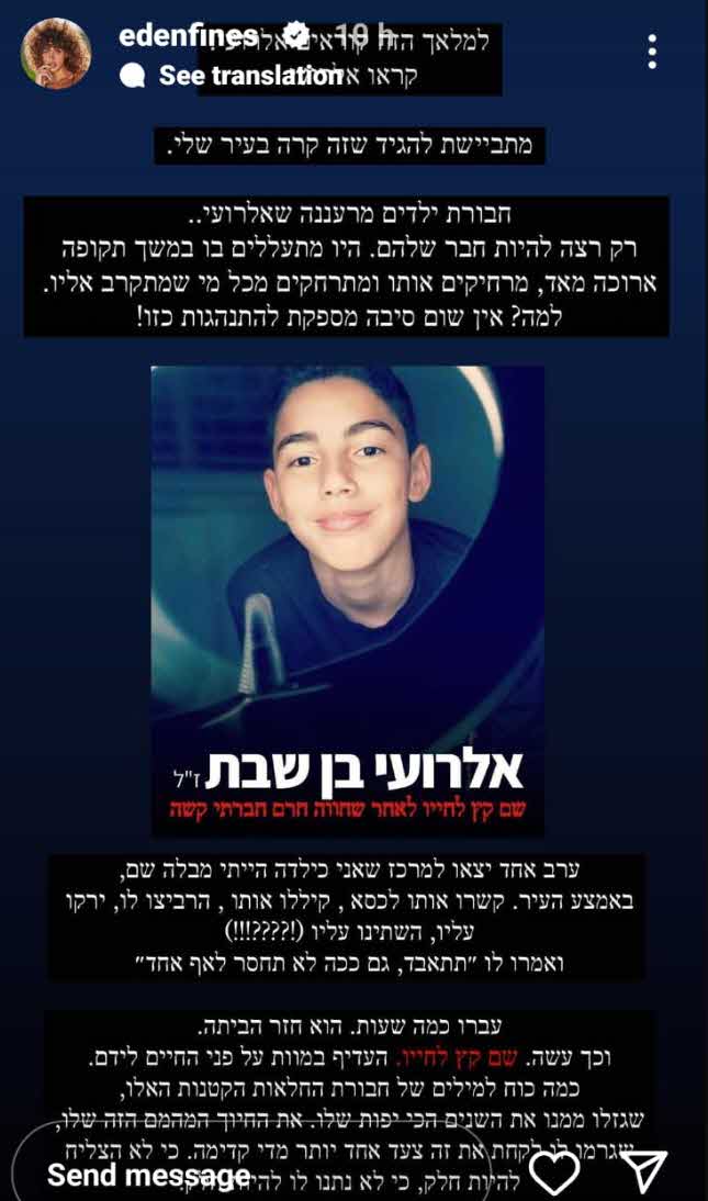 "כל המורים המתעלמים, ותאמינו לי שאני יודעת כמה הם מעלימים עין (!!!) שיכלו לתת יד, שיכלו לקחת אחריות, שיתחילו לפתוח את העיניים אני לא יכולה לחשוב על העובדה שיכולנו לעשות משהו ואולי הוא עוד היה כאן. שאף אחד לא יחווה עוד אבידה כזו. מלאך כזה, עיניים כאלו טובות. זה לא הגיע לו. ולא למשפחה שלו. מחבקת את המשפחה חזק ומבקשת סליחה. סליחה מכם וסליחה מהנשמה שלו שזה המחיר שאין לו מחיר שהייתם צריכים לשלם. יהיו זכרו ברוך"