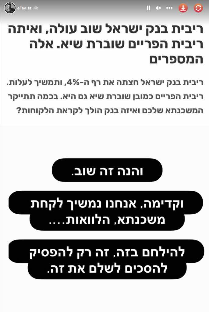 אליאב שנוטה לחלק לא מעט טיפים בנושאים פיננסיים לעוקביו כגון מיסוי על קניות, החזרי מס ועוד החליט להתייחס לבעיה הבוערת מכולן, יוקר המחיה, המיסוי הגבוהה ועליית הריביות במשק שגורמת ללא מעט משקי בית לקרוס תחת לחץ של הלוואות ומשכנתאות שרק מתנפחות.