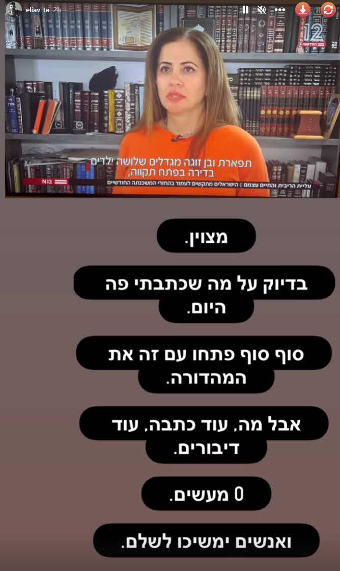 לגבי כתבה שעלתה בחדשות 12 על עליית הריבית והישראלים שמתקשים לעמוד בהחזרי המשכנתא החודשיים הגיב:"מצוין. בדיוק מה שכתבתי פה היום. סוף סוף פתחו עם זה את המהדורה. אבל מה, עוד כתבה, עוד דיבורי. 0 מעשים. ואנשים ימשיכו לשלם."