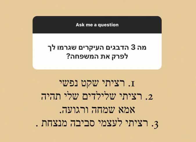 גרינברג אף הפתיעה וחשפה את שלושת הדברים העיקריים שהובילו אותה לפרק את החבילה עם אייל גולן:"1. רציתי שקט נפשי. 2. רציתי שלילדים שלי תהיה אמא שמחה ורגועה. 3. רציתי לעצמי סביבה מנצחת."