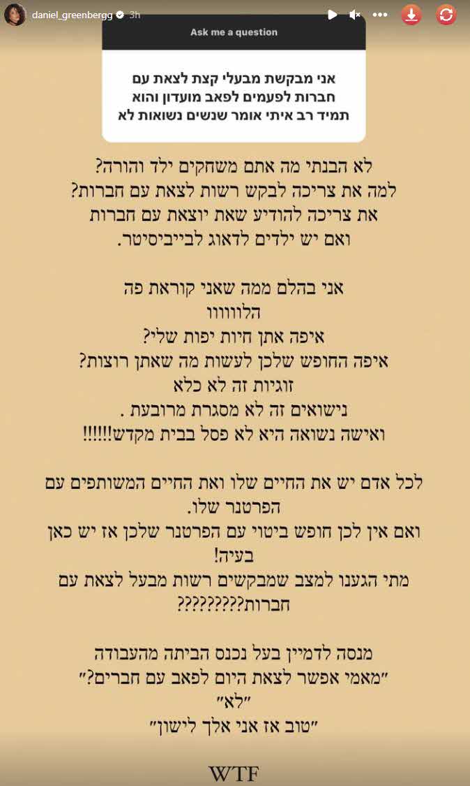 לאחר סוף שבוע קשה ועצוב במיוחד בצל הפיגועים והאווירה הקודרת, גרינברג החליטה לצאת בסדרת שיתופים מול עוקבותיה. אחת מהן הצליחה להפתיע אותה במיוחד כשכתבה לה:"אני מבקשת מבעלי קצת לצאת עם חברות, לפעמים לפאב או מועדון והוא תמיד רב איתי ואומר שנשים נשואות לא".