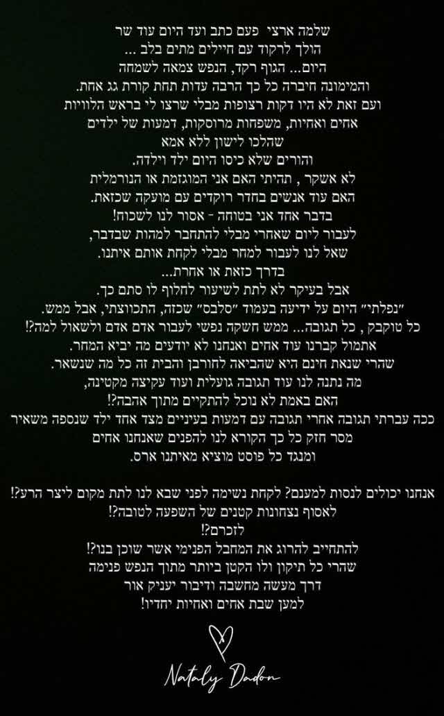 נטלי דדון אומנם ידועה בתור אחת שידעה לא מעט קרבות מול גולשים ברשתות החברתיות שיצאו עליה בטוקבקים מרושעים ולא מפרגנים. אך הפעם זה היה משהו אחר שהצליח להפר את שלוותה וגרם לה לשאול את עצמה:"לא אשקר, תהיתי האם אני המוגזמת או הנורמלית".