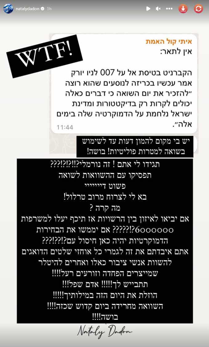 נטלי דדון מעבירה לא מעט מסרים פוליטיים לעוקביה בחשבון האינסטגרם שכידוע היא מזוהה בעיקר עם גוף הימין ונראה שהפעם, דווקא ביום השואה עלה פרסום שעשה שימוש פוליטי ביום הזה והצליח להוציא אותה מהכלים והיא ממש לא נשארה בחיבוק ידיים.