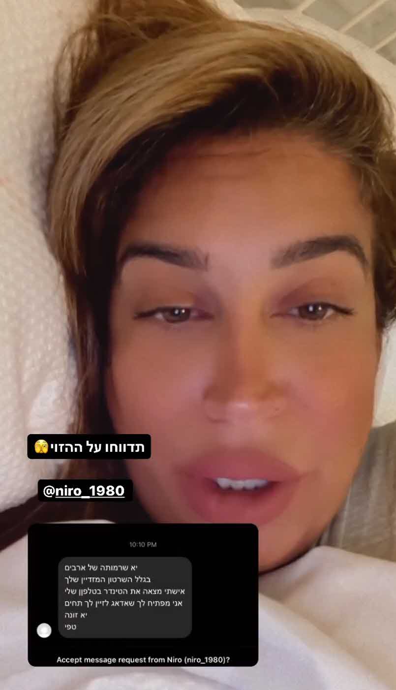 והמשיכה:"אבל אז אמרתי, זה פרופיל בכלל בדוי ולא יודעת או שמשעמם לך בחיים בערב יום השואה." והוסיפה:"במקום לאיים כמו איזה נמושה, אולי כדאי שתלך לפייס את אשתך, מה אתה אומר? אה? חוץ מזה צא מהצללים, תהיה גבר, תשלח מהפרופיל שלך, לא מבדוי, תתקדם."
