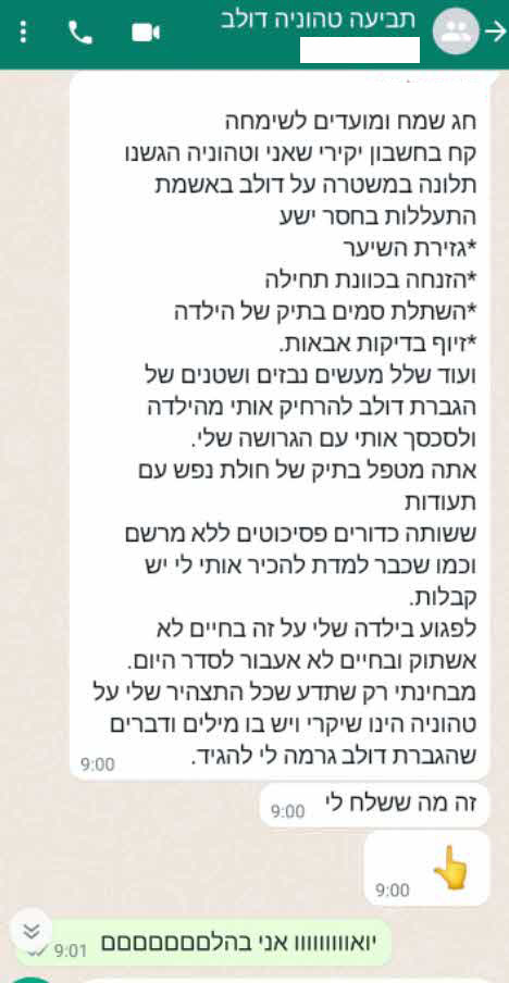 אך בטרם הסלמת הדברים בבית המשפט והמעצר, בתקופה שדולב הזמינה לו משטרה לטענתה לפני כשבוע וחצי. היא החליטה עכשיו לחשוף בפני שמועה הודעה אותה קיבלה אמא שלה, מירי מאותו האקס ואלו הדברים הקשים שהוטחו בפניה: