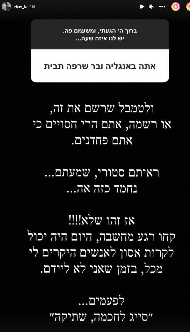 והוסיף:"ראיתם סטורי, שמעתם… נחמד כזה אה? אז זהו שלא! קחו רגע מחשבה, היום היה יכול לקרות אסון לאנשים היקרים לי מכל, בזמן שאני לא ליידם. לפעמים 'סייג לחכמה, שתיקה'" וסגר את הפינה מול אותו עוקב או עוקבת חצופה.