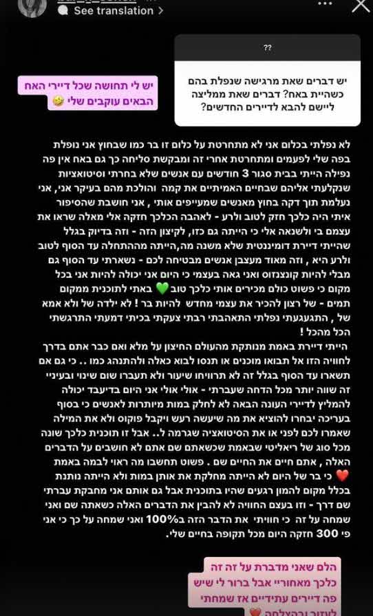 והוסיפה:"אז ברור שהרגעים הטובים שאני מצלמת הם אמיתיים וטוב לנו אבל נראה לך שאנחנו לא רבים או מתווכחים? איך חברה שלי פעם אמרה לי: 'אני נשואה 5 שנים ופעם בשבוע מתגרשת'. ברור, אנחנו בדיוק אבל בדיוק כמו כל זוג רגיל – אוהבים, רבים משלימים."