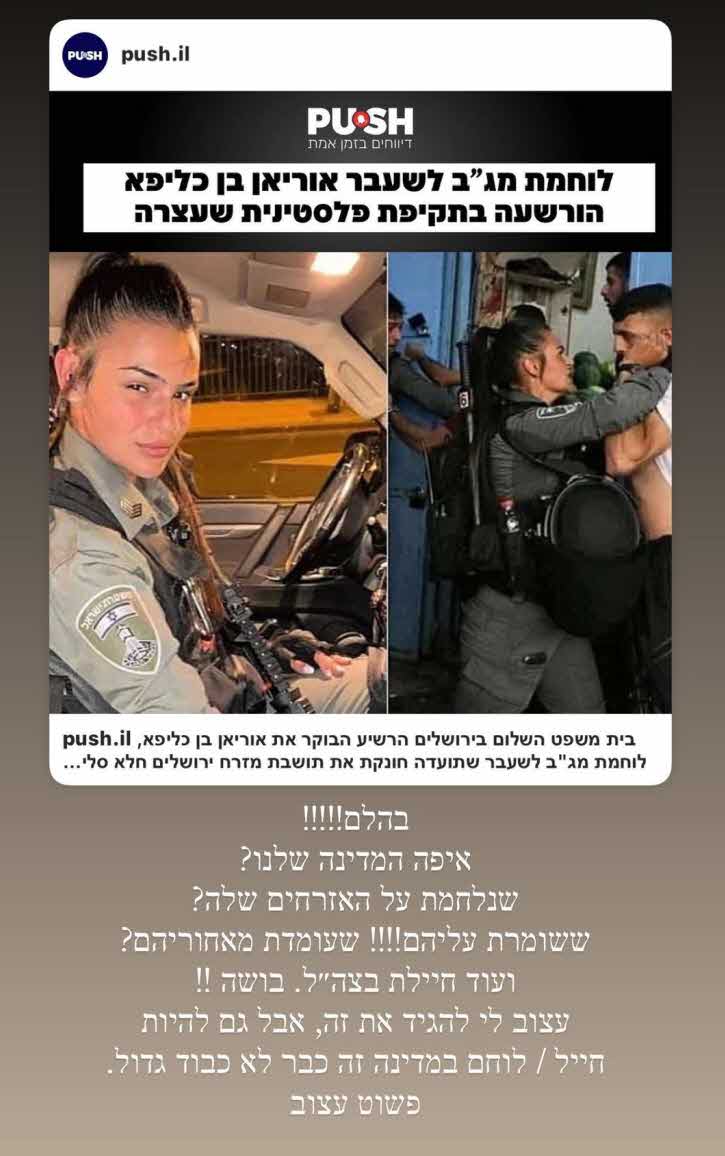 גרינברג שלא יכלה להישאר אדישה לפרסומים ברשת על הרשעתה של הלוחמת החליטה לצאת להגנתה בסטורי וכתבה:"בהלם! איפה המדינה שלנו? שנלחמת על האזרחים שלה? ששומרת עליהם! שעומדת מאחוריהם?"