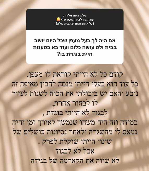 עוד הופנתה לגרינברג שאלה מהצד השני של המתרס:"את מאמינה שבגידה זו קארמה? אני באמת חכה שכבר הקארמה תחזיר לו, קשה לראות אותו מאושר". גרינברג השיבה לגולשת:"מאמינה כן, להפך.. אל תאחלי לו רע ואל תתעסקי בו."