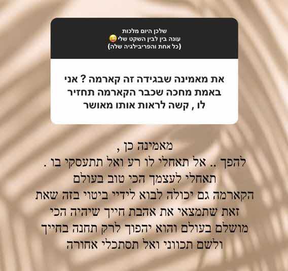 והוסיפה:"תאחלי לעצמך את הכי טוב בעולם. הקארמה גם יכולה לבוא לידיי ביטוי בזה שאת זאת שתמצאי את אהבת חייך שיהיה הכי מושלם בעולם והוא יהפוך לרק תחנה בחייך ולשם תכווני, ואל תסתכלי אחורה."