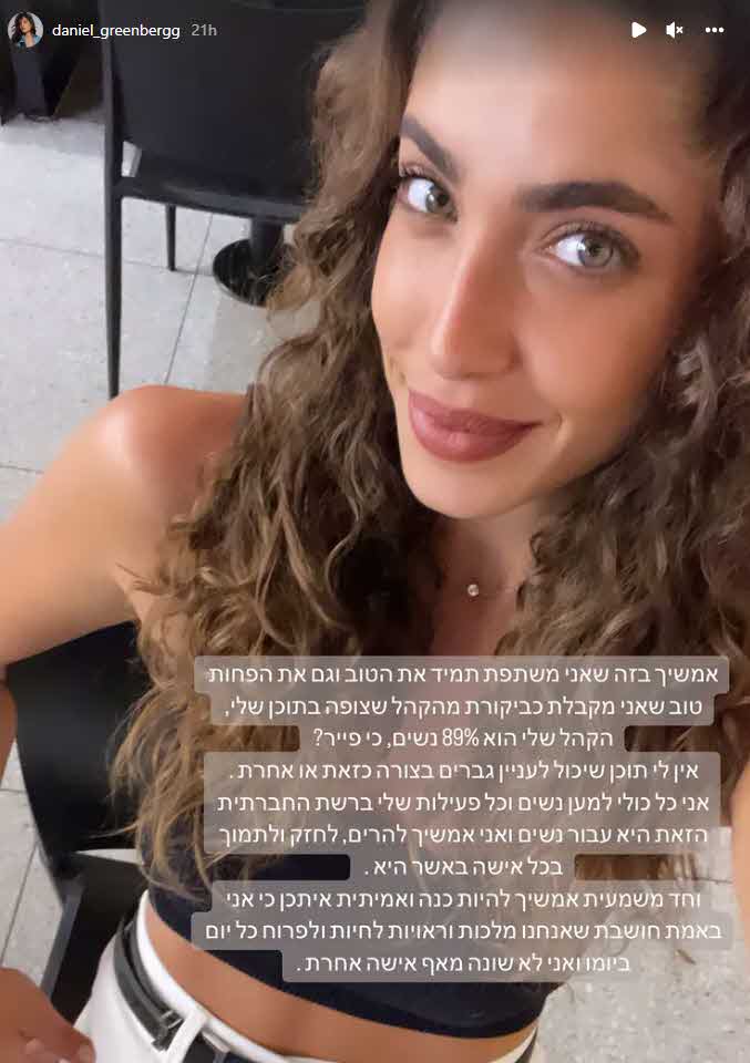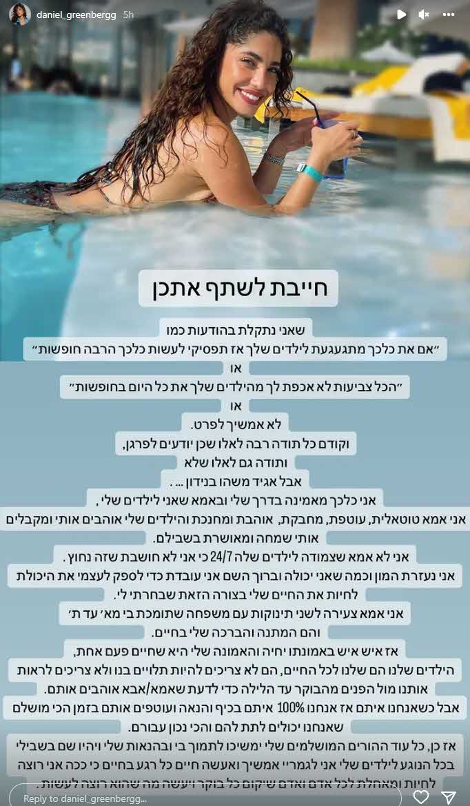 גרינברג שיתפה את עוקביה:"אני נתקלת בהודעות כמו 'אם את כל כך מתגעגעת לילדים שלך אז תפסיקי לעשות כל כך הרבה חופשות, הכל צביעות לא אכפת לך מהילדים שלך את כל היום בחופשות' לא אמשיך לפרט."