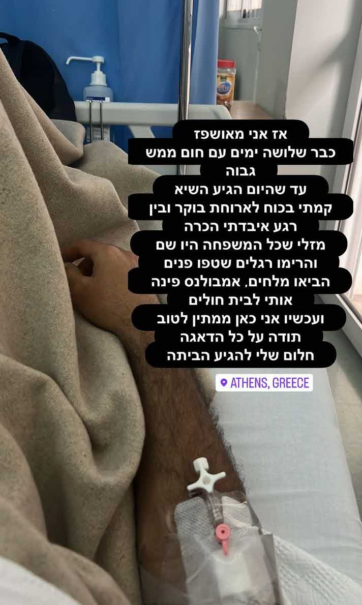 "מזלי שכל המשפחה היו שם והרימו לי את הרגלים, שטפו לי פנים, הביאו מלחים. אמבולנס פינה אותי לבית חולים ועכשיו אני כאן ממתין לטוב. תודה על כל הדאגה, חלום שלי להגיע הביתה".