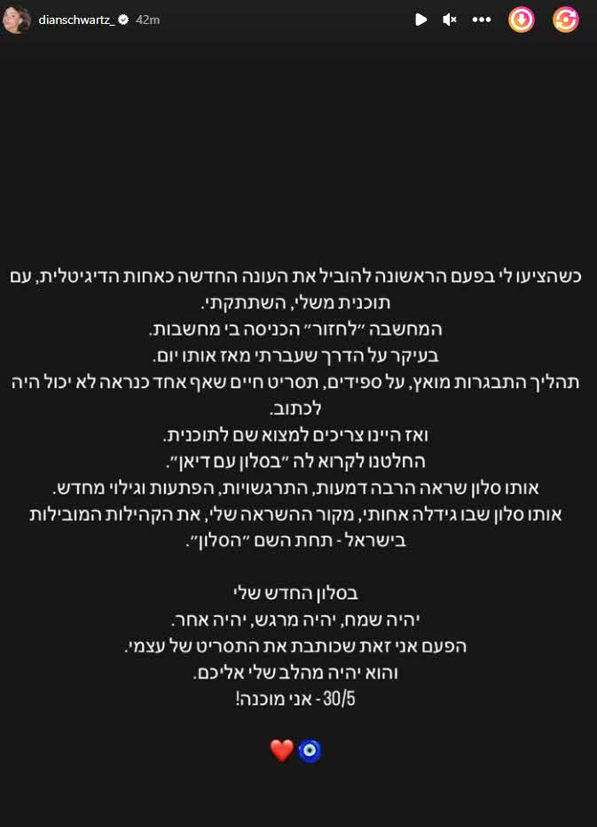 דיאן סיכמה:"בסלון החדש שלי יהיה שמח, יהיה מרגש, יהיה אחר. הפעם אני זאת שכותבת את התסריט של עצמי. והוא יהיה מהלב שלי אליכם. 30/5 אני מוכנה!"