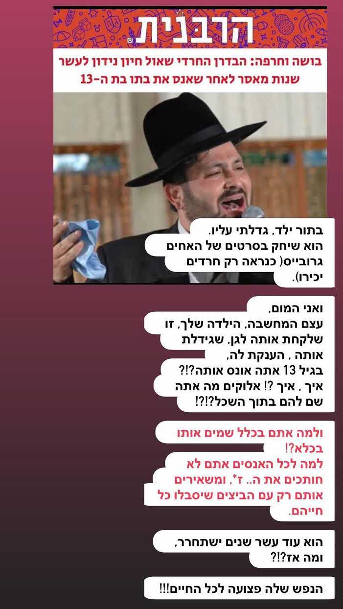 "בתור ילד, גדלתי עליו. הוא שיחק בסרטים של האחים גרובייס(כנראה רק חרדים יכירו). ואני המום. עצם המחשבה, ילדה שלך, זו שלקחת אותה לגן, שגידלת אותה, הענקתה לה, בגיל 13 אתה אונס אותה?!?"