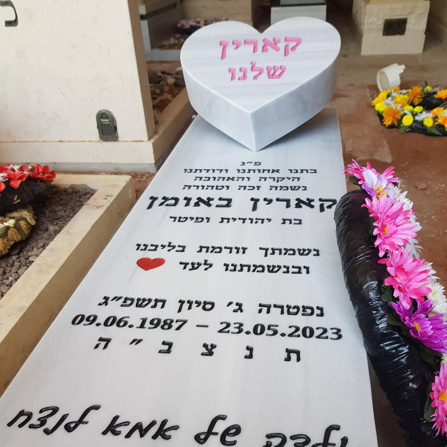 היום יהודית החליטה לשתף את תמונות המצבה של קארין שעליה נכתב:"קארין שלנו. בתנו אחותנו ודודתנו היקרה והאהובה, נשמה זכה וטהורה. קארין באומן בת יהודית ופיטר, נשמתך זורמת בליבנו ובנשמתנו לעד. ילדה של אמא לנצח".