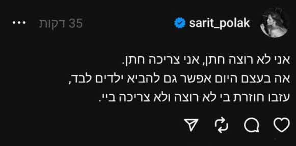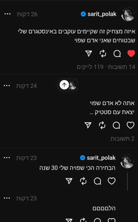 עוד ציוץ של שרית שהצליח להפוך לויראלי:"איזה מצחיק זה שקיימים עקובים באינסטגרם שלי שבטוחים שאני אדם שפוי". אחת הגולשות הגיבה לשרית:"את לא אדם שפוי, יצאת עם סטטיק…" שרית לא התבלבלה והשיבה:"הבחירה הכי שפויה שלי 30 שנה".