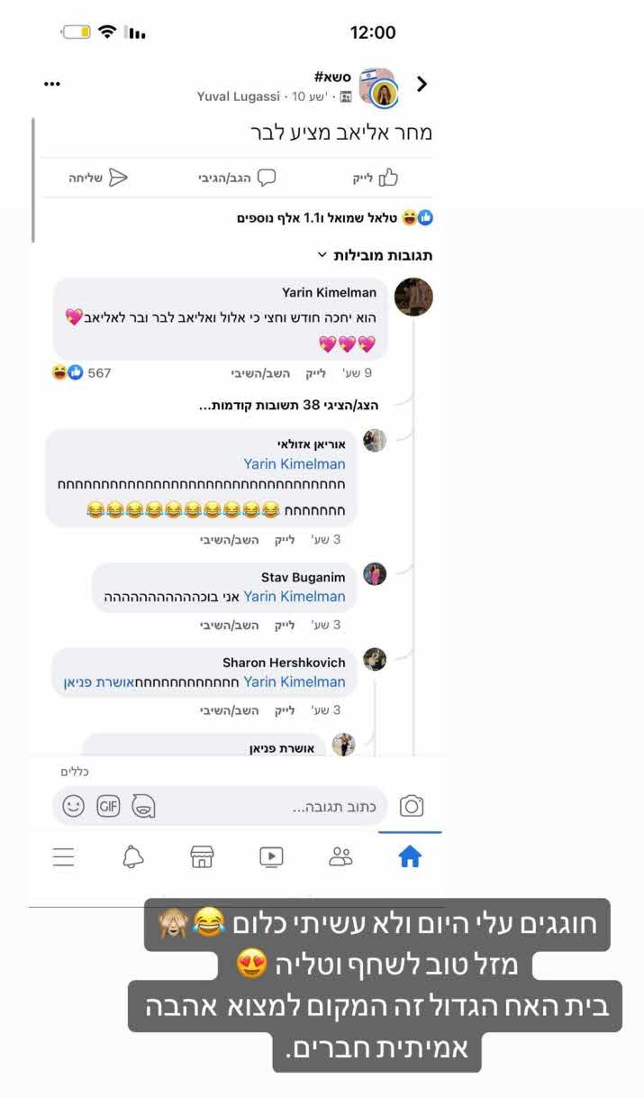 בר כהן לא נשארה אדישה והחליטה להגיב לאחד הפרסומים שבהן נכתב כהלצה:"מחר אליאב מציע לבר". בר כתבה בסטורי:"חוגגים עלי היום ולא עשיתי כלום. מזל טוב לשחף וטליה(*אמוג'י לבבות בעיניים*) בית האח הגדול זה המקום למצוא אהבה אמיתית חברים."